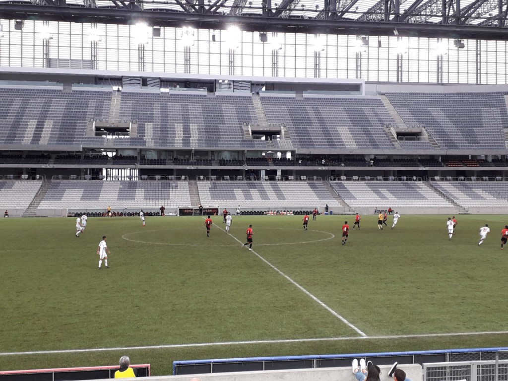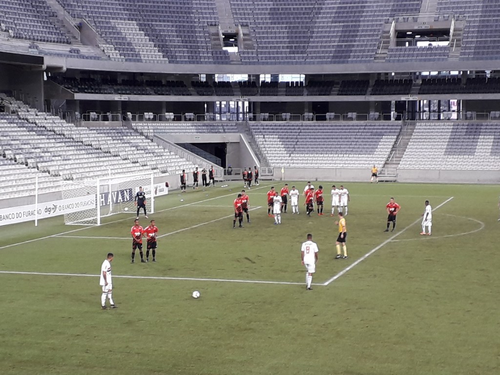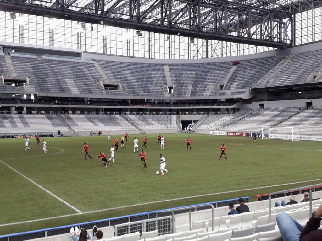 Há muito tempo eu não visitava a Arena da Baixada, mas hoje fui assistir a um jogo do Campeonato Brasileiro Sub-20 entre o Athletico e meu São Paulo. Quando cheguei ao estádio, fui informado que não havia ingressos à venda e que a entrada era exclusiva para sócios. Fiquei muito frustrado e pensei em ir embora, mas descobri que os sócios podiam levar um convidado. Esperei até que um sócio entrou, pedi para ser seu convidado e consegui entrar sem pagar. Infelizmente, o São Paulo perdeu sem marcar gols, mas foi bom retornar ao estádio após tanto tempo. Também consegui uns copos legais ao comprar refrigerante. Filmei alguns momentos do jogo, mas não capturei o único gol.